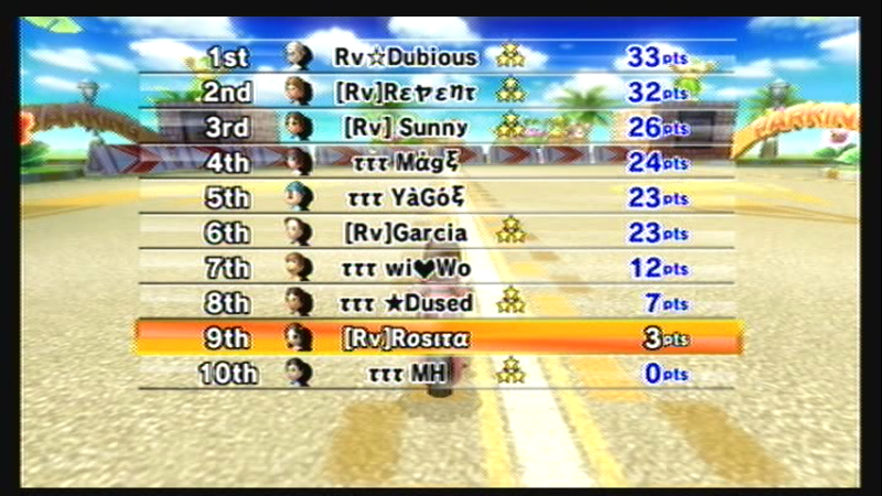 Erster GP ausgeglichen, im zweiten GP bekommt MagE Disconnect und wir ownen Rv mit 34 Punkten. Im dritten macht Rv urplötzlich nach Rennen 1 aus und wechselt Spieler ohne uns vorher auch nur Bescheid zu sagen. Dann kam natürlich nochmal 100ccm und wir verlieren die letzten 3 Rennen hoch, weil Rv in zwei davon den Blitz auf 9 zieht.